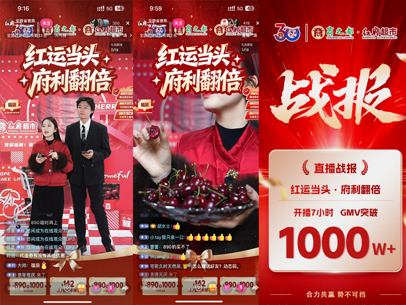商之都以“三十而礪 全心出發(fā)” 為主題的 12.19 跨品牌直播盛宴,在全網(wǎng)矚目下圓滿收官。此次直播聯(lián)動紅府超市、國生電器、徽商糖酒等品牌,打造從清晨至深夜的超長直播矩陣,推出大額代金券、智利車厘子特惠等多重福利,為商之都三十周年慶添上濃墨重彩的一筆。其中,紅府超市作為民生消費核心板塊表現(xiàn)亮眼,專屬直播七小時成交GMV突破千萬。
