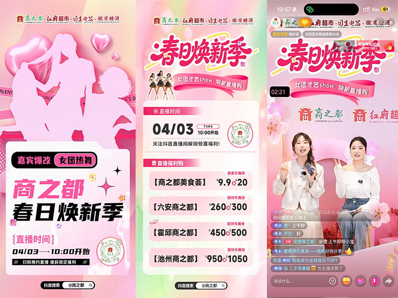 春風(fēng)送暖,萬物煥新,正是春日購物好時(shí)節(jié)。商之都以春日煥新季為核心主題,于4 月 3 日重磅打造專屬直播盛宴,打破傳統(tǒng)購物直播的單一模式,邀請人氣女團(tuán)空降助陣,創(chuàng)新推出員工爆改時(shí)尚環(huán)節(jié),將春日穿搭美學(xué)與超值購物福利融為一體,為消費(fèi)者帶來一場集視覺盛宴、潮流攻略、寵粉福利于一體的煥新消費(fèi)新體驗(yàn)。