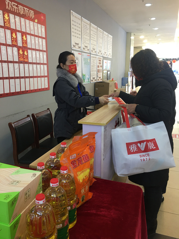 節(jié)日期間,綜合部人員在總服務(wù)臺(tái)為顧客提供購物抽獎(jiǎng)等惠民服務(wù)。