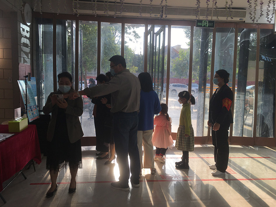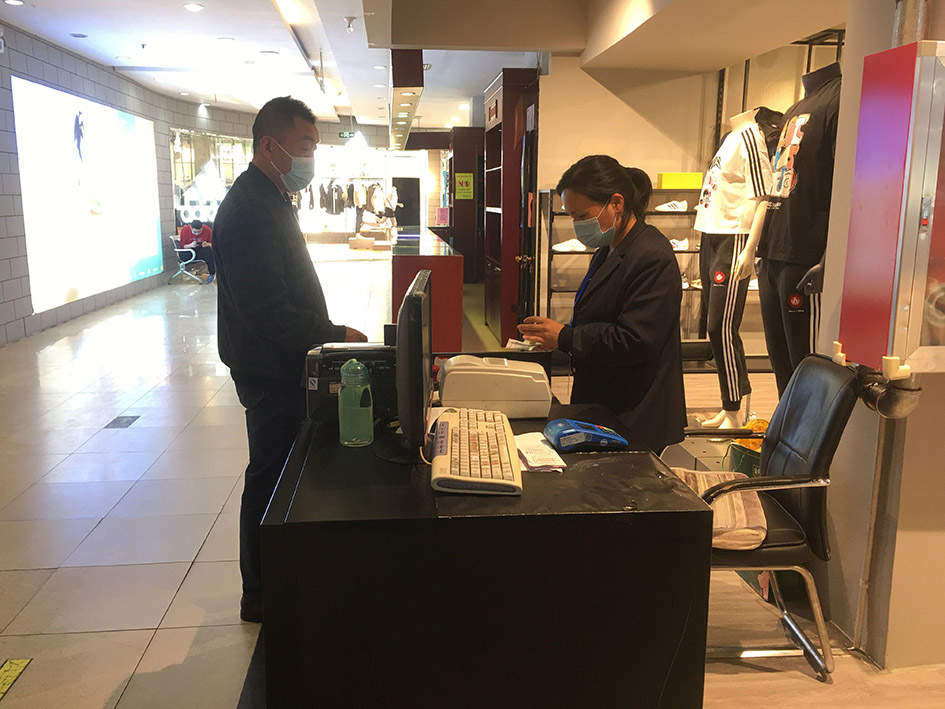 “五一”當(dāng)天,商場客流增多,服務(wù)保障部門堅(jiān)守“一小時(shí)輪崗”制度,同安保人員對進(jìn)店顧客進(jìn)行測溫、驗(yàn)雙碼、提醒規(guī)范佩戴口罩工作。