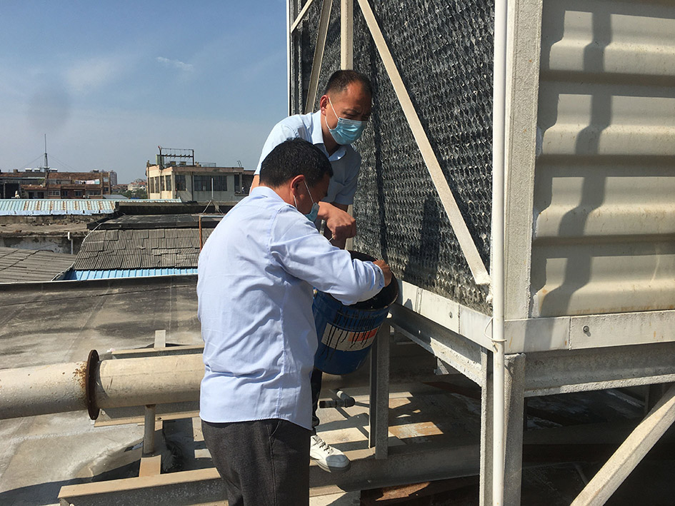 后勤保障部電工班組利用晴好天氣對空調(diào)冷卻塔進(jìn)行維護(hù)。