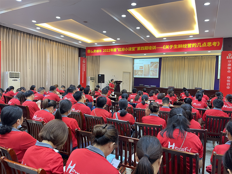 生鮮商品是超市經(jīng)營(yíng)的核心,為進(jìn)一步加強(qiáng)生鮮商品的陳列效果,提高門(mén)店生鮮的經(jīng)營(yíng)水平,及時(shí)控制損耗,紅府公司2022年度“紅府小課堂”第四期于9月29日開(kāi)講。公司各中心主管崗位以上人員及門(mén)店負(fù)責(zé)人、生鮮課課長(zhǎng)近120人參加了現(xiàn)場(chǎng)培訓(xùn)。