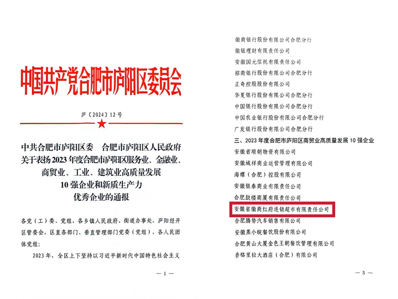3月1日,中共合肥市廬陽區(qū)委、合肥市廬陽區(qū)人民政府表彰了2023年度合肥市廬陽區(qū)服務業(yè)、金融業(yè)、商貿(mào)業(yè)、工業(yè)、建筑業(yè)高質量發(fā)展10強企業(yè)和新質生產(chǎn)力優(yōu)秀企業(yè)。安徽省徽商紅府連鎖超市有限責任公司榮獲廬陽區(qū)商貿(mào)業(yè)高質量發(fā)展十強企業(yè)。