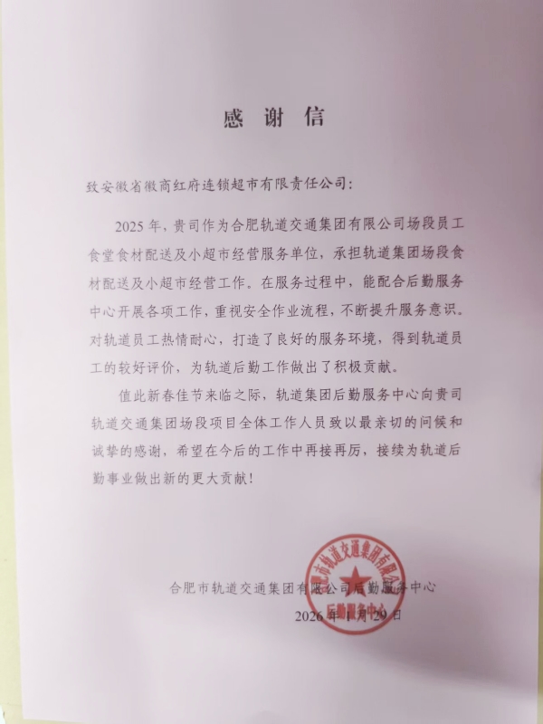 一紙感謝,見證日常堅守的專業(yè)見證。合肥軌道交通集團在信中,對紅府超市在食材配送、超市運營全過程中的專業(yè)表現(xiàn)給予高度肯定-始終嚴(yán)守食品安全標(biāo)準(zhǔn)、規(guī)范作業(yè)流程細節(jié)、保障物資穩(wěn)定供應(yīng),更以超越合同約定的暖心服務(wù),為城市軌道交通運營提供了堅實后勤支撐。,作為保障民生的國企力量,紅府始終筑牢食品安全放在首位,以扎實穩(wěn)健的運營管理,精益求精的服務(wù)標(biāo)準(zhǔn),守護市民舌尖上的安全與日常消費便利,深刻詮釋了國企在城市后勤保障領(lǐng)域的硬核實力與責(zé)任底色。