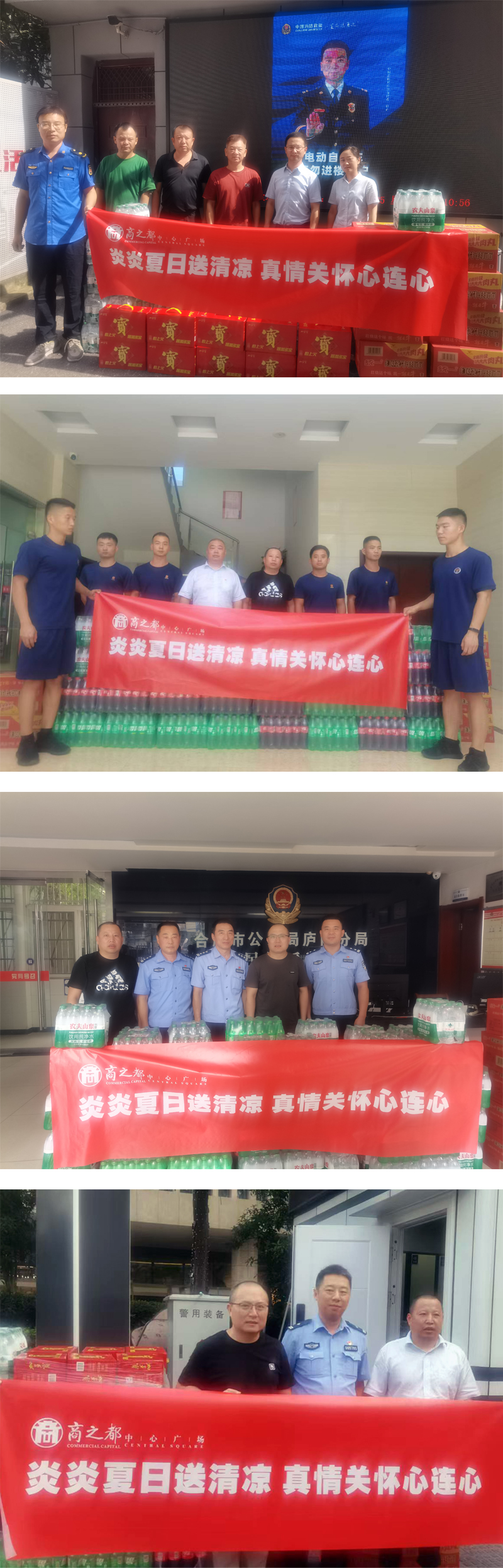 中心廣場為炎炎夏日仍堅守崗位的值班民警、消防隊員、交警隊員、城管一線人員送去了防暑降溫物品,并對益民街派出所為轄區(qū)治安維穩(wěn)、消防大隊為切實保障人民生命財產(chǎn)安全、交警二中隊為保障交通安全、逍遙津街道城管中隊為保障城市整潔所付出的艱辛和努力均表達了深深地感謝。
