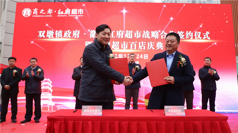 開業(yè)儀式前,雙墩鎮(zhèn)鎮(zhèn)長王世德與紅府超市董事長王正共同簽訂了戰(zhàn)略合作協(xié)議,雙方將聯(lián)手共同推動(dòng)合作向縱深發(fā)展,紅府超市將在雙墩鎮(zhèn)打造更多的鎮(zhèn)企合作示范店并加快紅府雙墩農(nóng)業(yè)基地建設(shè),為當(dāng)?shù)鼐用駧砀啾憷蛯?shí)惠。