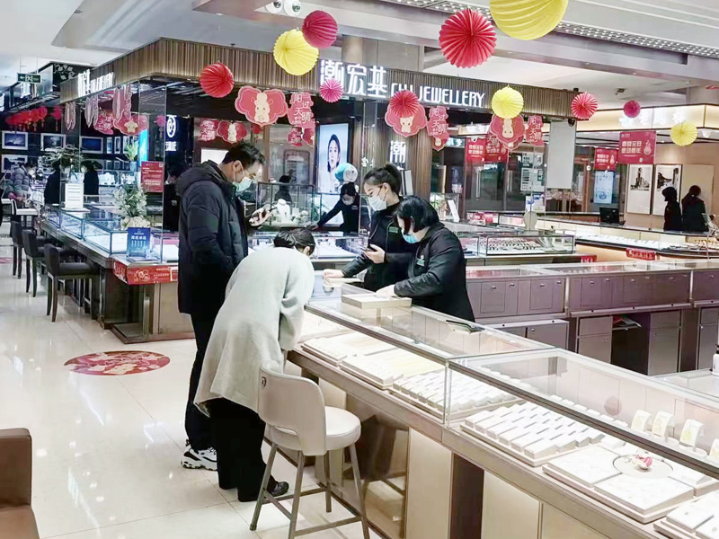 春節(jié)我在崗,貼心為您服務(wù)。大年三十,顧客到六福專柜挑選珠寶首飾,專柜員工正在耐心服務(wù)。