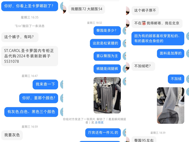 “小紅書上有顧客咨詢圣卡蘿女裝,請盡快回復下”。三樓女裝賣場圣卡蘿店長收到信息后第一時間回關了顧客。在交談中得知,顧客遠在北京,無法到店試穿,確定不了自己所穿尺碼的大小,想通過提供尺寸,幫推薦合適的型號。了解到顧客的需求和顧慮后,圣卡蘿店長找到賣場中身材比例與顧客相似的員工進行試穿,并將試穿效果和建議反饋給顧客,針對顧客提出的疑問一一解答。經(jīng)過長達5小時的信息交流溝通后,顧客最終決定下單購買。