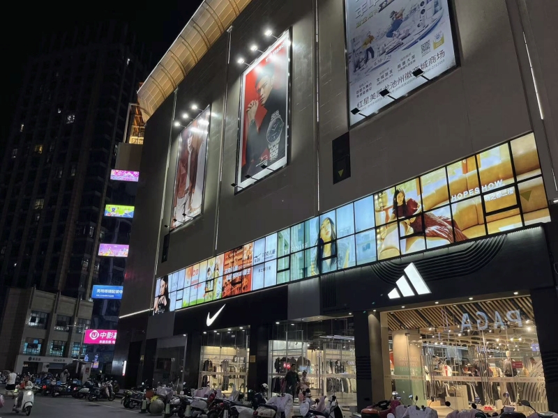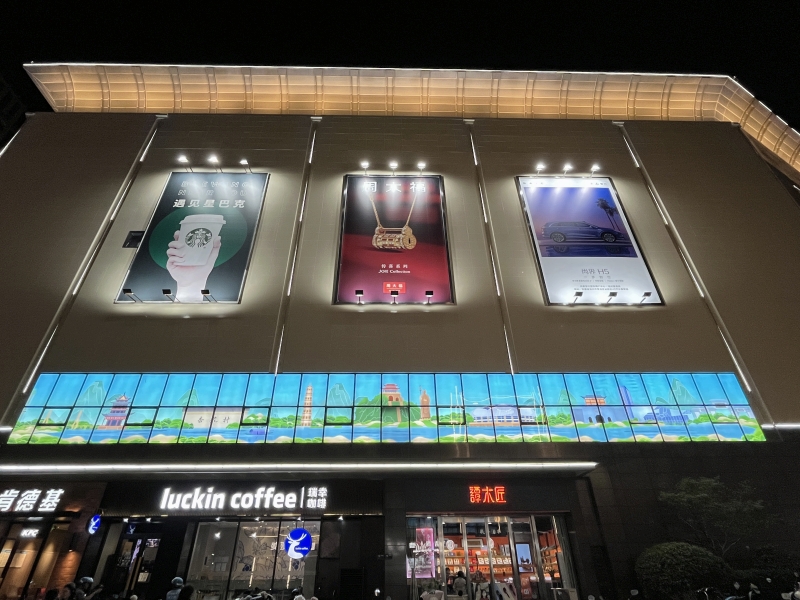 外立面亮化改造工程,對約7000㎡的外立面進(jìn)行深度清潔與修繕,增設(shè)近景輪廓燈、門頭檐燈等亮化設(shè)施。工程盤活閑置櫥窗改造為主題燈箱-百牙路一側(cè)聚焦品牌展示,烘托購物氛圍;長江路一側(cè)融入九華山、秋浦河、杏花等本土文化元素,讓商業(yè)建筑成為展示窗口。同時(shí),拆除直梯原鋼架廣告牌,更換為逐層展示場內(nèi)品牌的燈箱,兼顧亮化與宣傳功能。目前已完工并進(jìn)入驗(yàn)收階段。