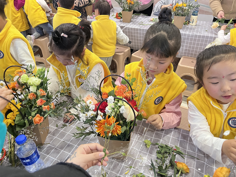 活動(dòng)現(xiàn)場(chǎng)花香四溢,老師在講臺(tái)上為小朋友與家長(zhǎng)們細(xì)心的講解鮮花的花語(yǔ),仔細(xì)的對(duì)鮮花進(jìn)行修剪,按照步驟一步一步的教導(dǎo)大家如何搭配才能另鮮花更有層次的搭配在一起。小朋友們耐心的聽(tīng)講,選擇花朵,枝葉搭配色彩,在家長(zhǎng)的幫助下剪下多余的花枝,調(diào)整長(zhǎng)短,整理花束,逐步將鮮花有層次的搭配在一起,完全沉浸在花藝的創(chuàng)作中。